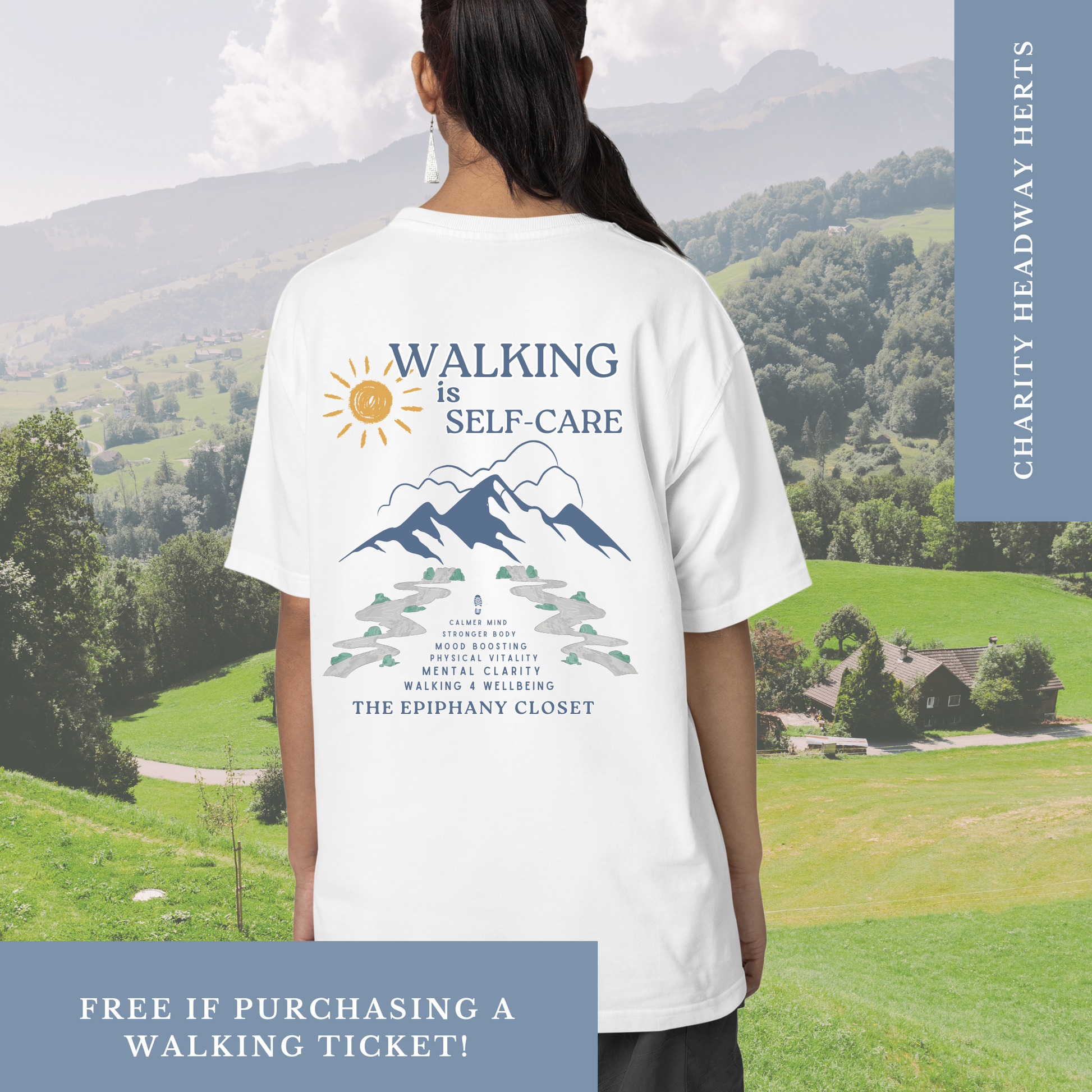 Walking is Self-Care t-shirt, raising money for Headway Herts brain injury charity. Be inspired by being part of the walking 4 Wellbeing community. Luxury organic cotton tee, not just for an event, but to remind you the importance of using exercise for your health self-care & wellbeing.